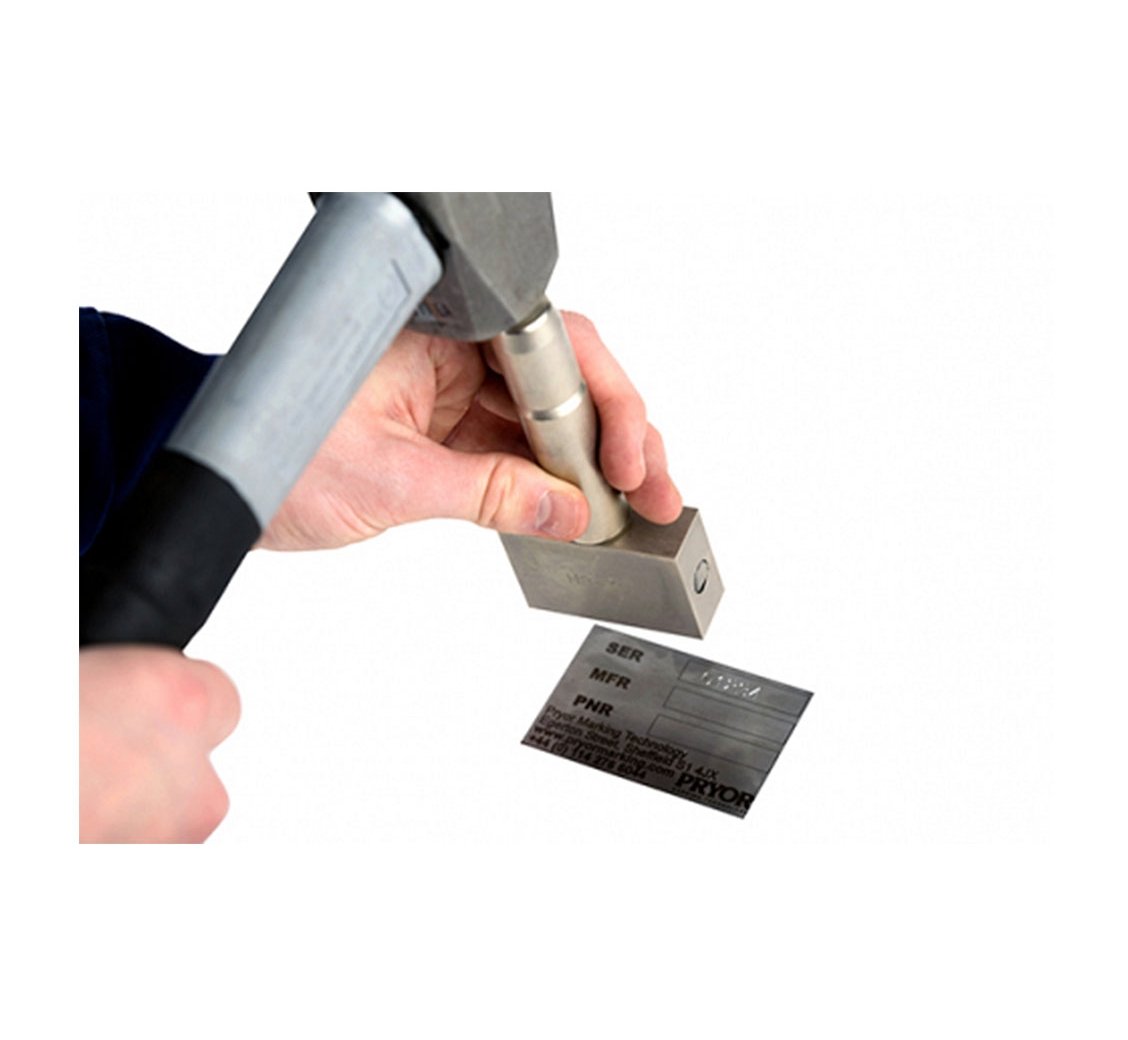 Pryor Low-Stress Steel Type available in 2 character heights, packs of individual characters, set of 26 characters A-Z, Set of 10 characters 0-9, Set of 100 alpha-numeric and punctuation characters according to the most common use plus spacer pieces for non-marking positions and Hand Holder.
