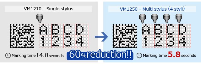 Vector VM1250 Multi-stylus Pen Marking Machine delivers semi-permanent marking on a wide range of metals, including steel, stainless steel, and aluminum, as well as plastics and other nonmetallic materials. It is designed to handle marking needs for production management, quality assurance, product-liability countermeasures, ISO measures, distribution management, and more.
