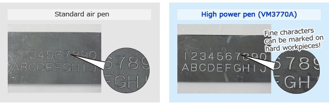 VM3730A Ultrasonic Pen Marking Machine delivers semi-permanent marking on a wide range of metals, including steel, stainless steel, and aluminum, as well as plastics and other nonmetallic metals. It is designed to handle marking needs for production management, quality assurance, product-liability countermeasures, ISO measures, distribution management and more.